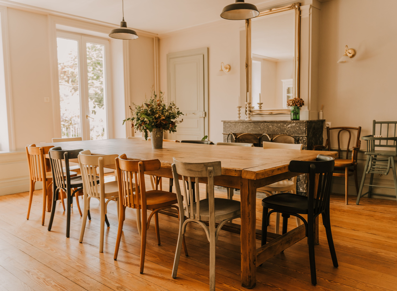 La grande table de la salle à manger chinée sur Le Bon Coin. Ses dimensions généreuses s’intègrent parfaitement, on dirait qu’elle a toujours été là !